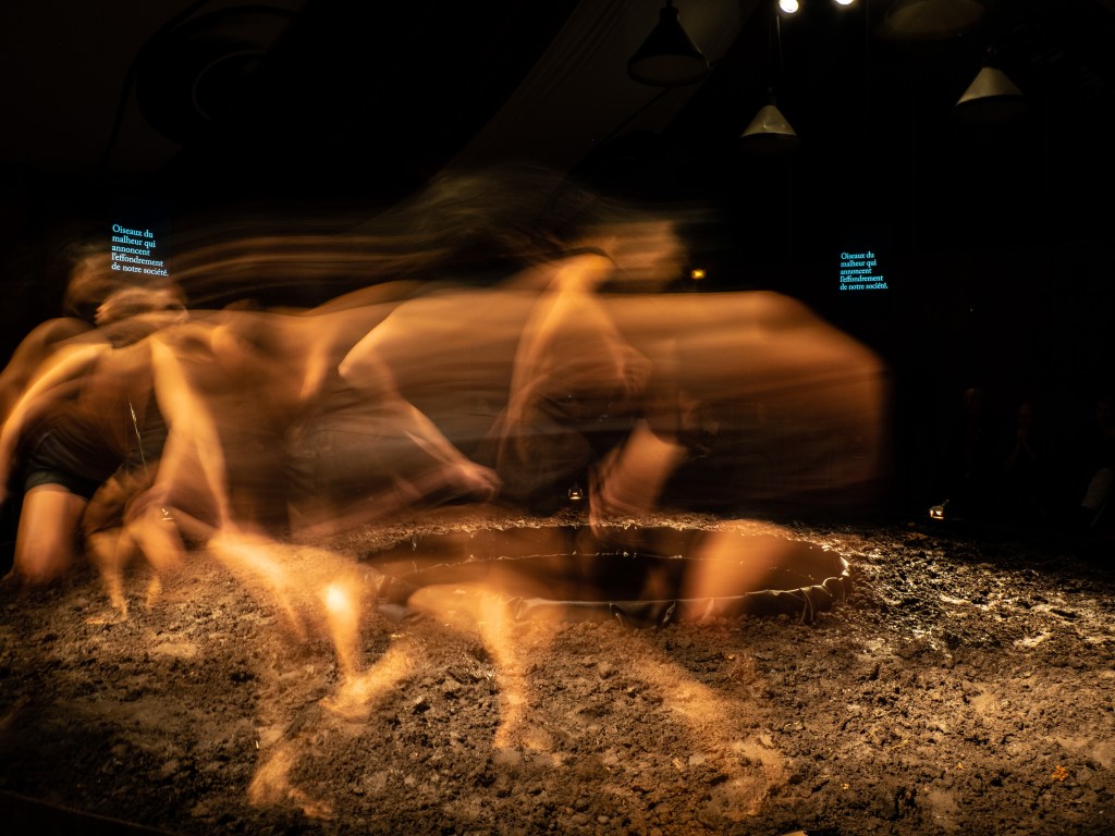 Le procès, en voix off, est la grille dramaturgique qui tire les lignes d’un récit en fond de toile. Le procès structure le discours qui nous incrimine et dévoile les faits dans leur plus objective lucidité. Suspendues sous la grille de ce récit, se trouvent des bulles de respiration poétique qui creusent l’abcès pour nous inspirer dans une théâtralité de la matière, de la chorégraphie, du rêve. Le geste poétique glisse entre les mailles du discours en déMiant la raison pour faire éclater les verrous de l’imaginaire.